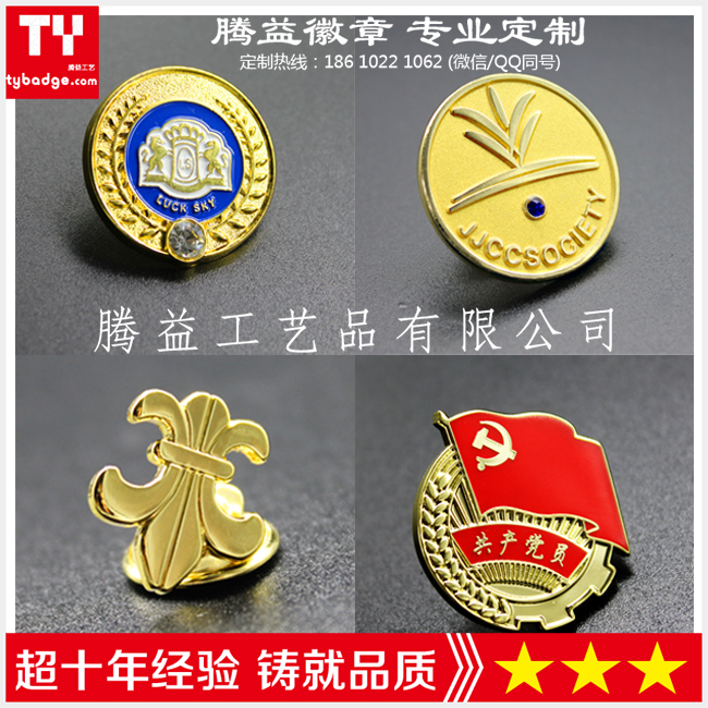 主要工藝有:蝕刻(咬板)、壓沖、注漆(填油)、絲印、滴膠、仿琺瑯、鋅合金壓鑄、柯式印刷等。材料可選用銅、鐵、鋅合金、馬口鐵、亞克力、鋁、鉛錫合金、PVC等材料。