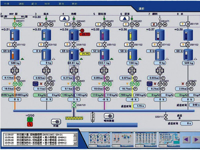 調(diào)施膠系統(tǒng)由稱重計量系統(tǒng)、PLC控制系統(tǒng)和上位機監(jiān)控系統(tǒng)三部分組成。稱重系統(tǒng)起稱重和流量計量作用,由失重式流量控制儀表完成,失重式流量儀表是24位的淡片機集成,精度高,計算速度快;PLC是整套控制系統(tǒng)的心臟,控制著整套系統(tǒng)的所有流程;上位機系統(tǒng)只要是起監(jiān)控、修改參數(shù)和數(shù)據(jù)記錄等作用。系統(tǒng)特點1、采用現(xiàn)場分布式施膠,膠水,固化劑、水分別獨立按比例打到混合槽混合后,直接打到噴放管道,保證了膠水的質(zhì)量。2、石蠟以計量方式打到進料螺旋管道中,保證施石蠟均勻性。3、采用減重式膠水流量秤,準確計量出膠、固化劑、水和石蠟等的流量,避免根據(jù)泵轉(zhuǎn)速反映流量,由于泵磨損所帶來的誤差。4、PLC根據(jù)磨機螺旋速時時計算出磨機產(chǎn)能,連續(xù)自動調(diào)節(jié)施膠量,實現(xiàn)施膠比例恒定。5、可根據(jù)鋪裝生產(chǎn)線上的實際產(chǎn)能,對理論產(chǎn)能進行修正。6、可全程監(jiān)控整套系統(tǒng)設(shè)備的生產(chǎn)情況,并具有故障報警提示和記錄功能。