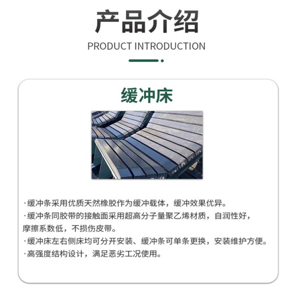緩沖床用于落料點(diǎn)代替普通緩沖托輥,能有效避免尖銳物體插入膠帶從而防止撕裂膠帶。整體托住膠帶,落料時(shí)膠帶不會(huì)凹陷,有效導(dǎo)正落料,防止膠帶跑偏,防止物料溢出。整體承受物料沖擊,相對(duì)于單個(gè)承受沖擊緩沖托輥,壽命大大提高。
