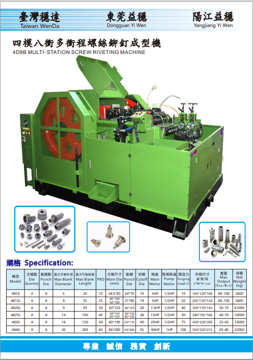 4、通過數(shù)十位益穩(wěn)工程師精心組裝。讓益穩(wěn)多沖程及多工位冷鐓成型機具備高精度、高速度,高耐磨性,整機標配:帶變頻器、陽模退料,六個沖均帶PKO,剎車,半密封型;在冷鐓零件外徑切料,變形量,長度,超載調試等方面滿足非標螺絲多樣化開發(fā);如:臺階螺絲,大扁頭螺絲,抽芯鉚釘,電子通訊精密螺絲,