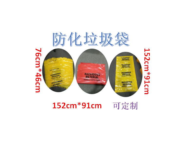 防化垃圾袋,又稱為“有害廢物垃圾袋”、“有害廢物處理袋”。英文名稱為 “Hazardous Waste Bags”、 “Hazardous Material waste bags”、“Hazardous Material Disposal Bags”。材質(zhì)厚度顏色編輯一般為堅(jiān)韌的聚乙烯材質(zhì),少數(shù)也有PP聚丙烯材質(zhì)的。單面的厚度一般在8絲。當(dāng)然,也可依據(jù)實(shí)際 需要,做得比8絲更厚。顏色一般為黃色,這樣就更顯眼,更易識別。袋子上一般印有“有害廢物”的警示的內(nèi)容或者“小心處理”的警示內(nèi)容。 Carries bold "Caution Handle With Care" reminder。